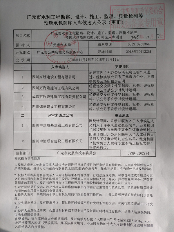 廣元市水利工程勘察、設(shè)計(jì)、施工、監(jiān)理、質(zhì)量檢測(cè)等預(yù)選承包商庫(kù)入庫(kù)候選人公示(更正)