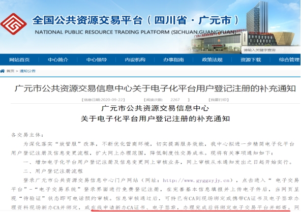 《廣元市公共資源交易信息中心關(guān)于電子化平臺(tái)用戶登記注冊(cè)的補(bǔ)充通知》