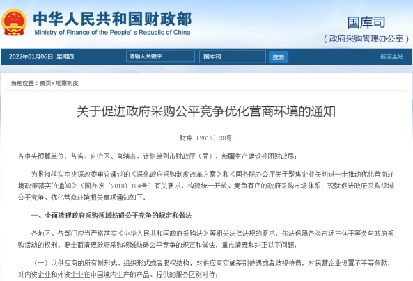 (1)《財(cái)政部關(guān)于促進(jìn)政府采購(gòu)公平競(jìng)爭(zhēng)優(yōu)化營(yíng)商環(huán)境的通知》(財(cái)庫(kù)〔2019〕38號(hào))